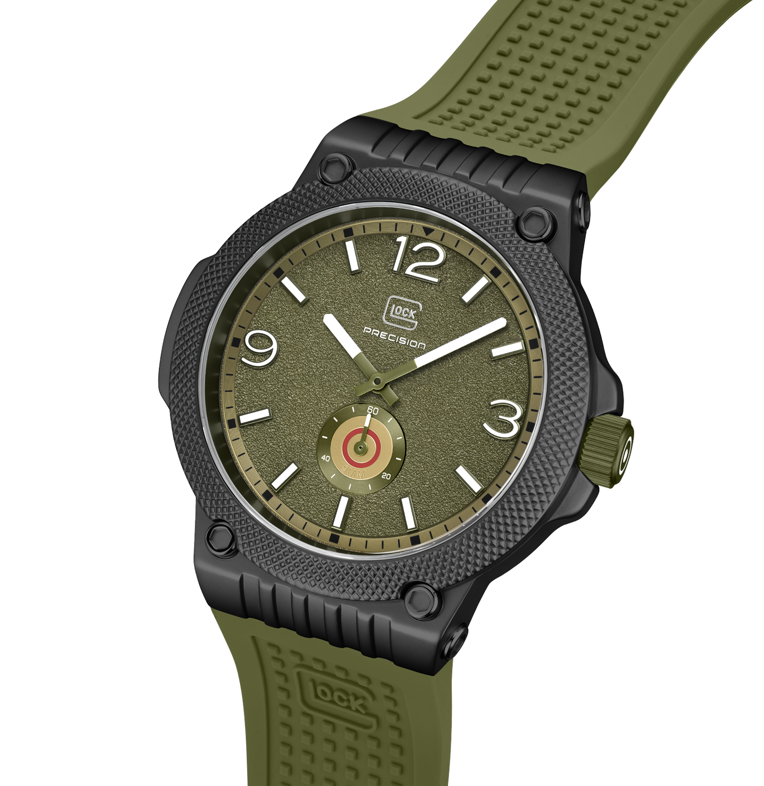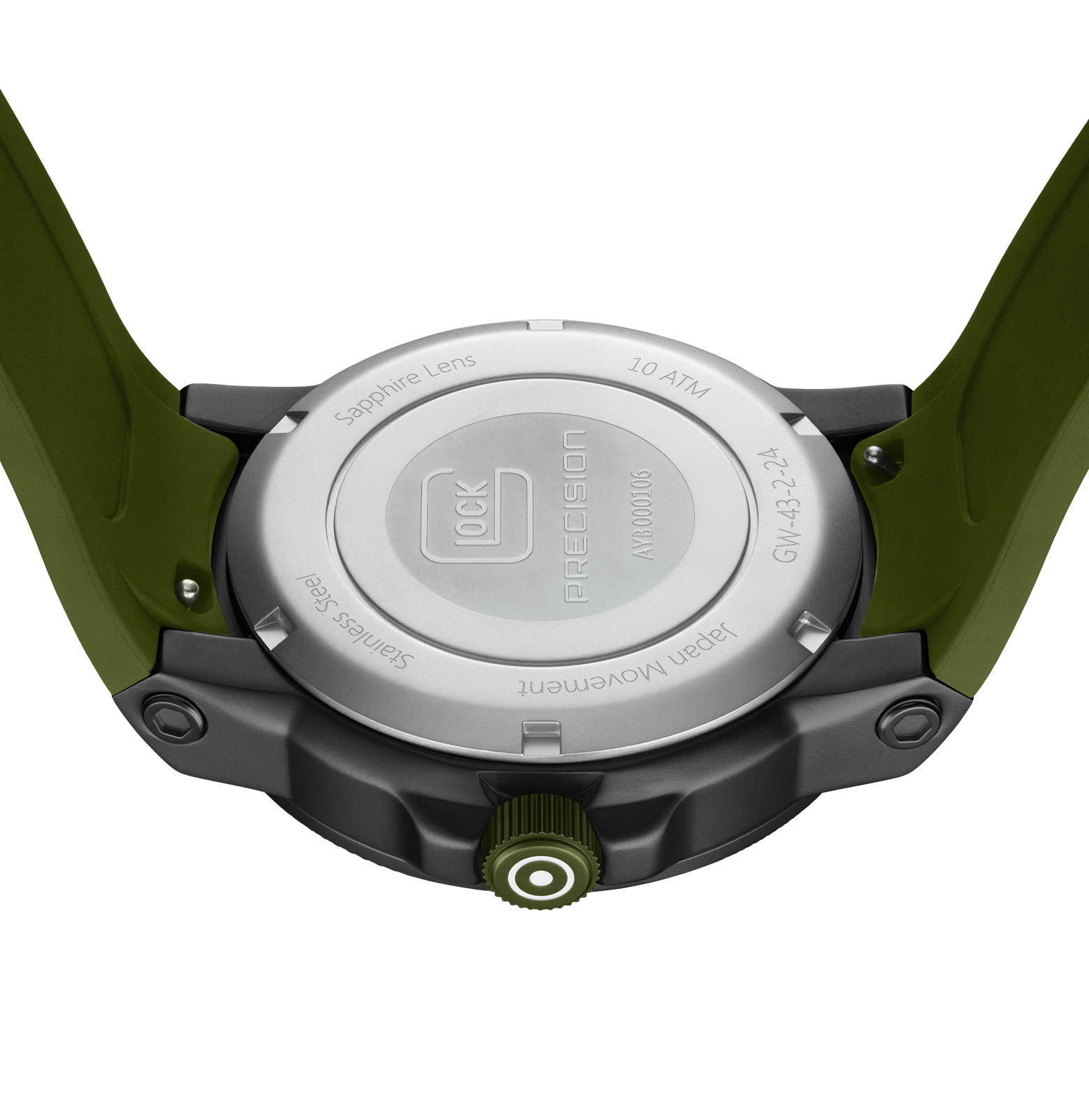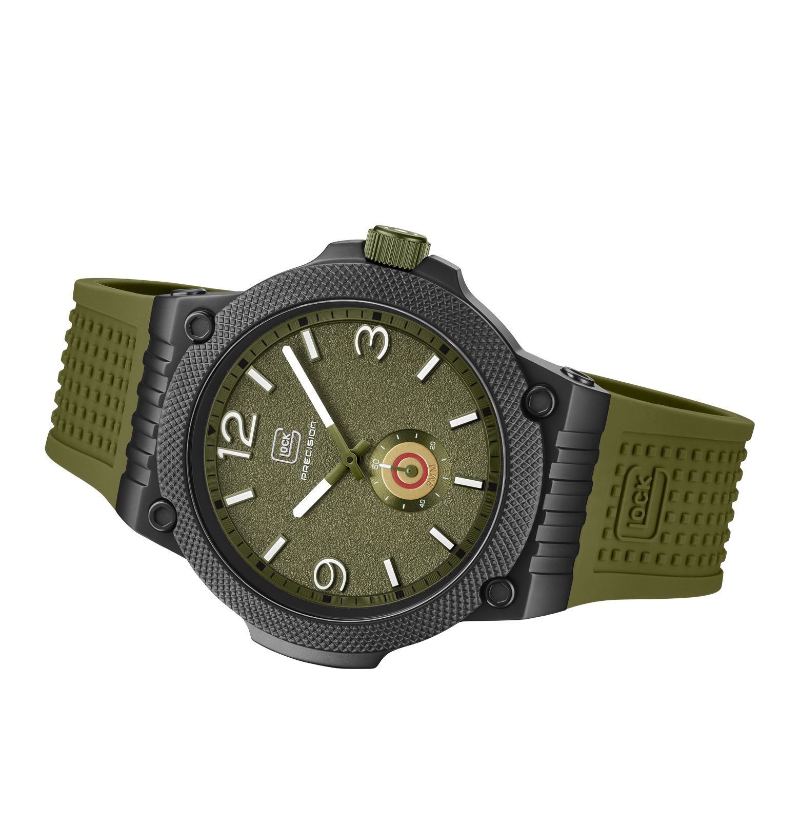 Tactical precision meets bold design in this distinctive GLOCK timepiece. The gunmetal stainless steel case is framed by a bezel with GLOCK’s iconic RTF texture - mirroring the grip of GLOCK’s core product. Set against a rugged olive green dial, the luminous white hands and indices with Swiss Super-LumiNova® ensure perfect readability in low light. A unique design element at 6 o’clock recalls the bottom of a bullet casing, reinforcing the watch’s strong ballistic identity. The army green silicone strap, embossed with the GLOCK logo and RTF pattern, provides exceptional comfort and grip. With a scratch-resistant sapphire crystal and 10 ATM water resistance, this watch is built for those who demand uncompromising performance - on any terrain.