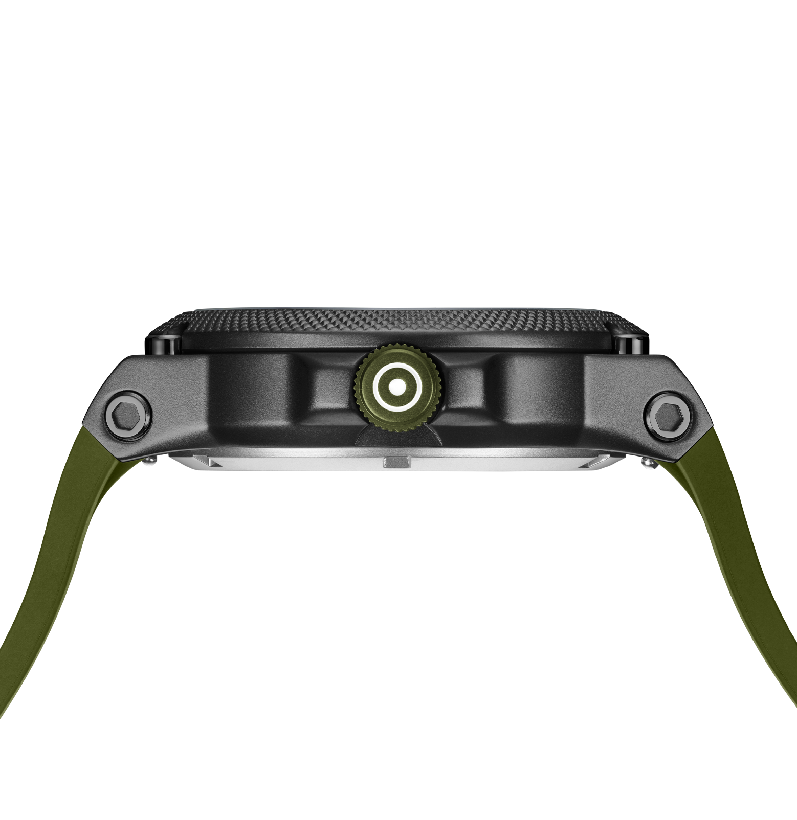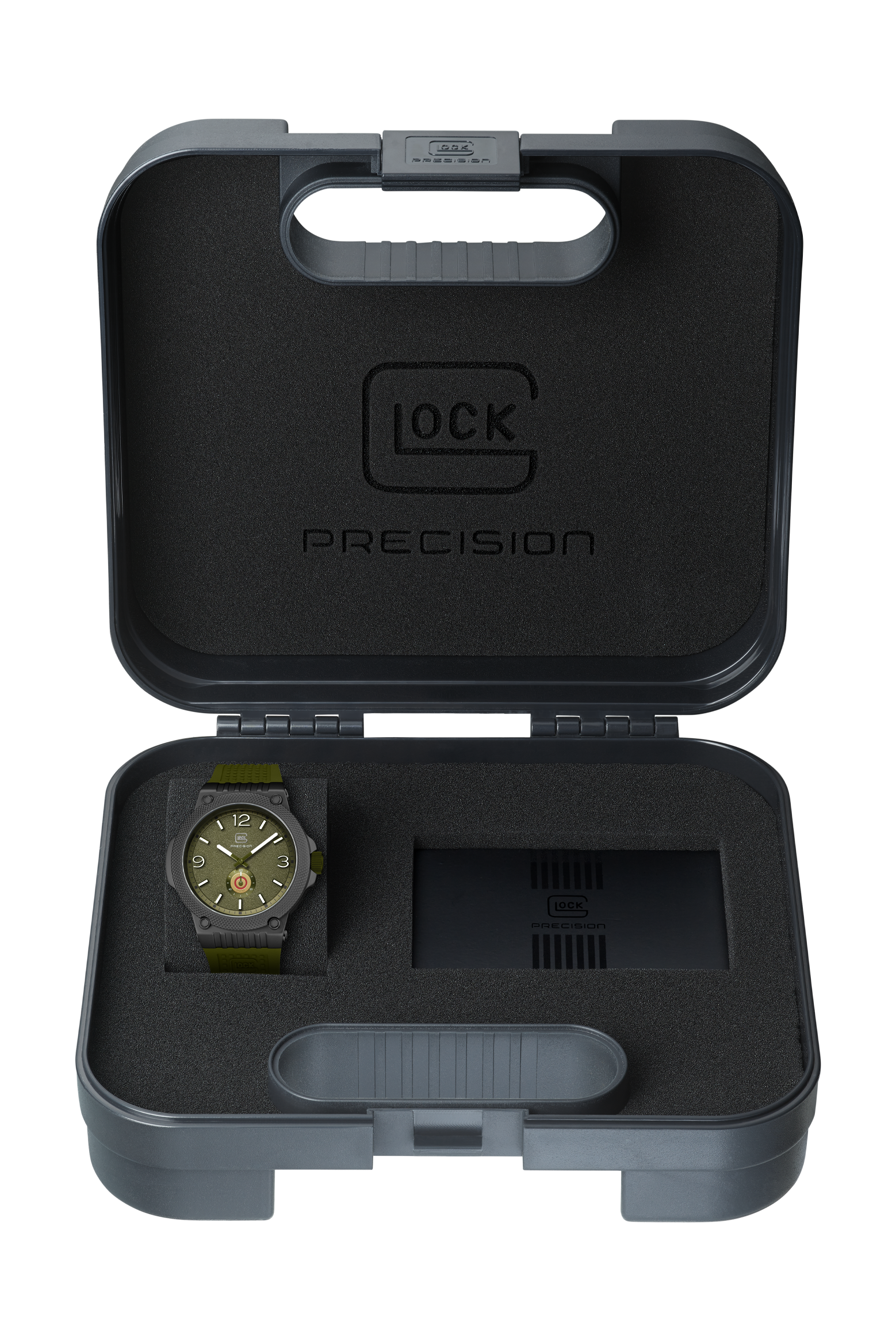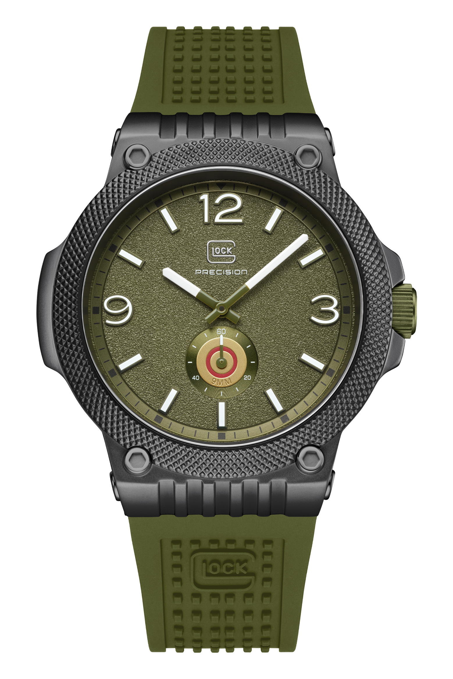 Tactical precision meets bold design in this distinctive GLOCK timepiece. The gunmetal stainless steel case is framed by a bezel with GLOCK’s iconic RTF texture - mirroring the grip of GLOCK’s core product. Set against a rugged olive green dial, the luminous white hands and indices with Swiss Super-LumiNova® ensure perfect readability in low light. A unique design element at 6 o’clock recalls the bottom of a bullet casing, reinforcing the watch’s strong ballistic identity. The army green silicone strap, embossed with the GLOCK logo and RTF pattern, provides exceptional comfort and grip. With a scratch-resistant sapphire crystal and 10 ATM water resistance, this watch is built for those who demand uncompromising performance - on any terrain.