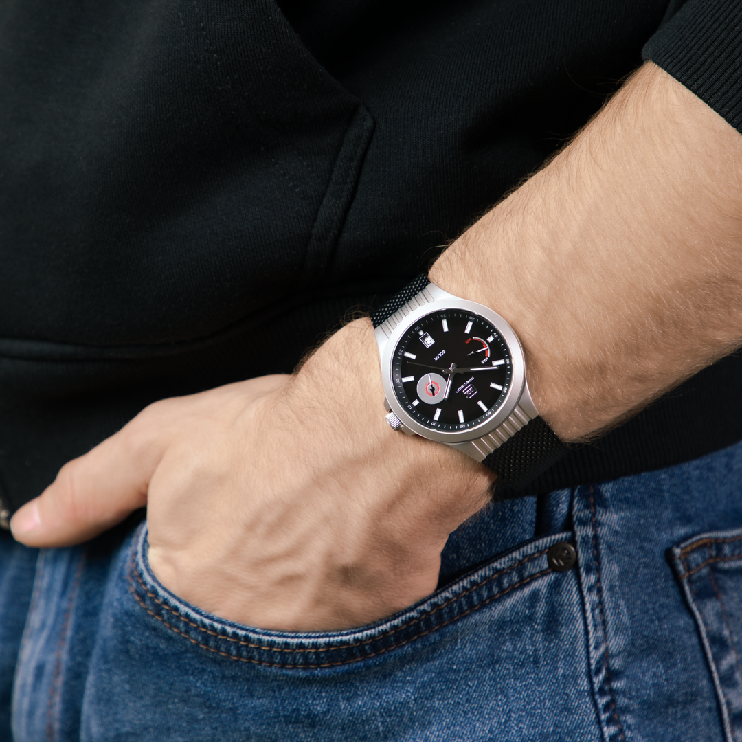 A combination of precision and functionality. The stainless-steel case encloses a deep black dial illuminated by indices and hands with Swiss Super-LumiNova®. A standout feature of the dial is the power reserve indicator, ensuring you always have insight into your watch's solar energy status, accompanied by the distinctive detail of a bullet casing with red accents. Complemented by a sturdy stainless steel mesh strap, powered by a reliable solar movement, and rated to 10 ATM water resistance, this watch represents sophisticated design and technical precision.