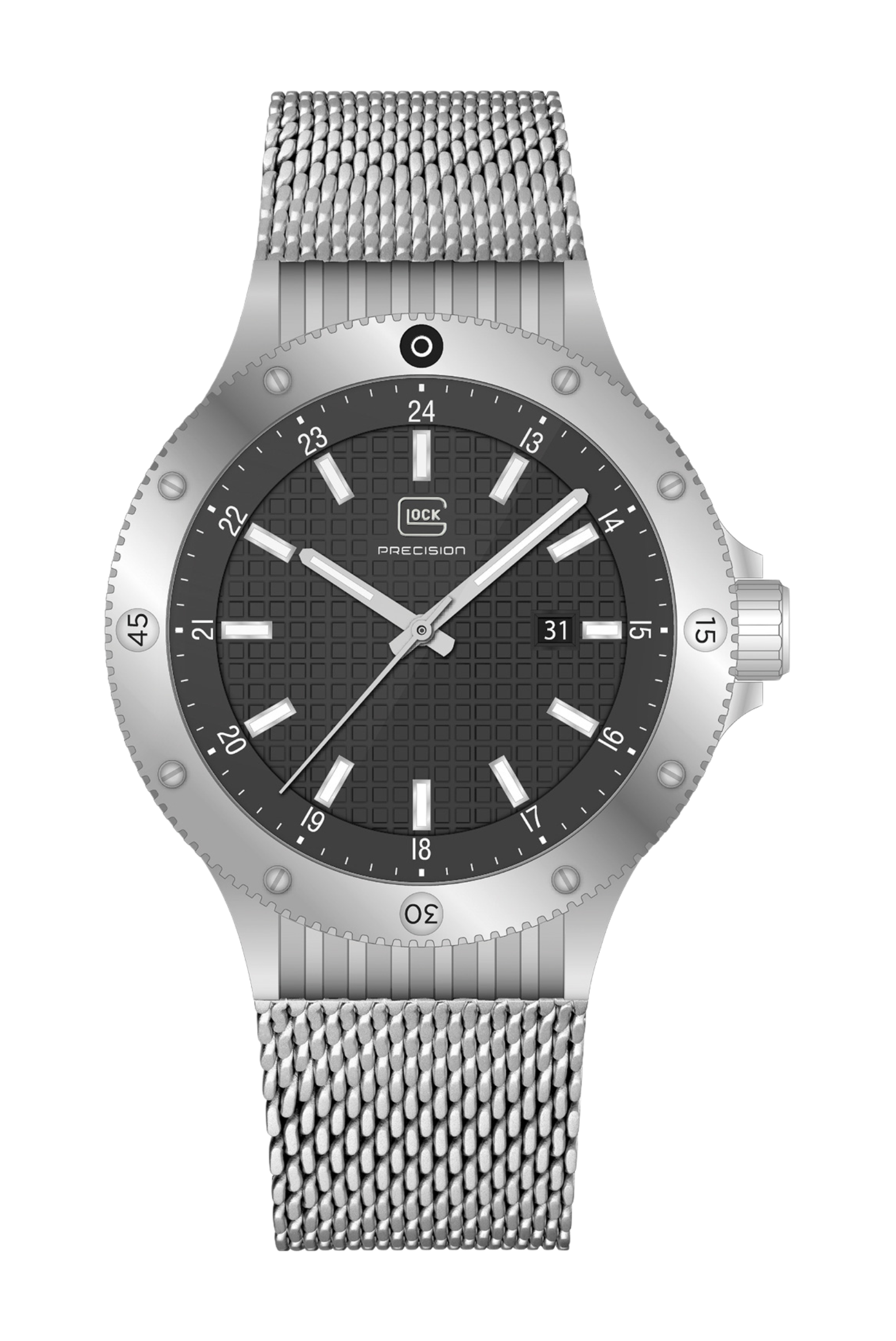 Zeitloses Design trifft auf technische Präzision in dieser edlen Armbanduhr. Das silberfarbene Edelstahlgehäuse umschließt ein schwarzes Zifferblatt mit der charakteristischen RTF-Struktur von GLOCK und erzeugt so einen dezenten, aber kraftvollen Kontrast. Silberfarbene Zeiger und Indizes mit Swiss Super-LumiNova® sorgen in jeder Lichtsituation für hervorragende Ablesbarkeit und spiegeln die präzise Verarbeitung der Uhr wider. Das abgestimmte silberfarbene Mesharmband verleiht dem Design eine moderne Note und bietet zugleich sicheren, angenehmen Tragekomfort. Mit einer Wasserdichtigkeit von 10 ATM vereint diese Uhr Robustheit, Klarheit und Eleganz – geschaffen für alle, die Präzision bis ins kleinste Detail schätzen.