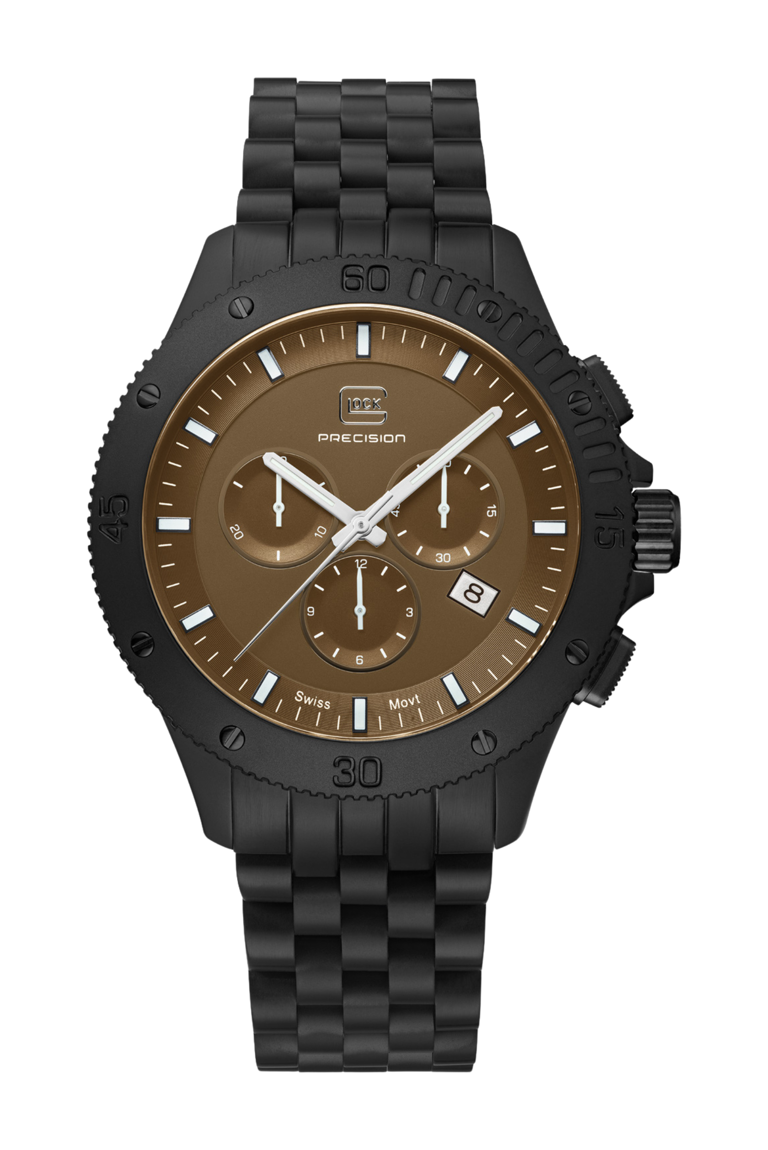 Kraft und Präzision definieren diese ausdrucksstarke Armbanduhr. Das schwarze, sandgestrahlte Edelstahlgehäuse umschließt ein vollständig braunes Zifferblatt, das einen eindrucksvollen Kontrast zu den silberfarbenen Zeigern und Indizes mit Swiss Super-LumiNova® bildet und so optimale Ablesbarkeit gewährleistet. Die integrierte Chronographenfunktion unterstreicht die technische Leistungsfähigkeit der Uhr, während das robuste schwarze Edelstahl-Gliederarmband einen selbstbewussten Look und hohen Tragekomfort bietet. Angetrieben von einem zuverlässigen Schweizer Uhrwerk und wasserdicht bis 20 ATM, verkörpert diese Uhr Stärke, Ausdauer und elegantes Design – geschaffen für alle, die Leistung ohne Kompromisse verlangen.