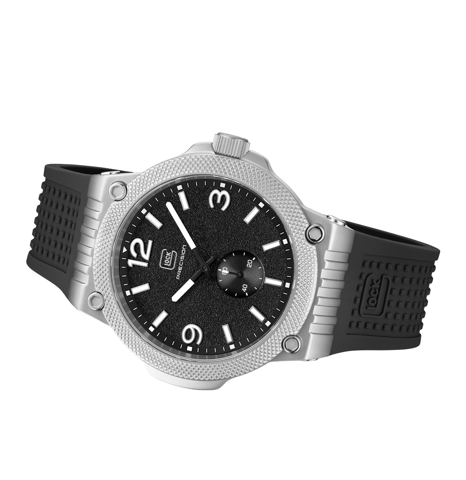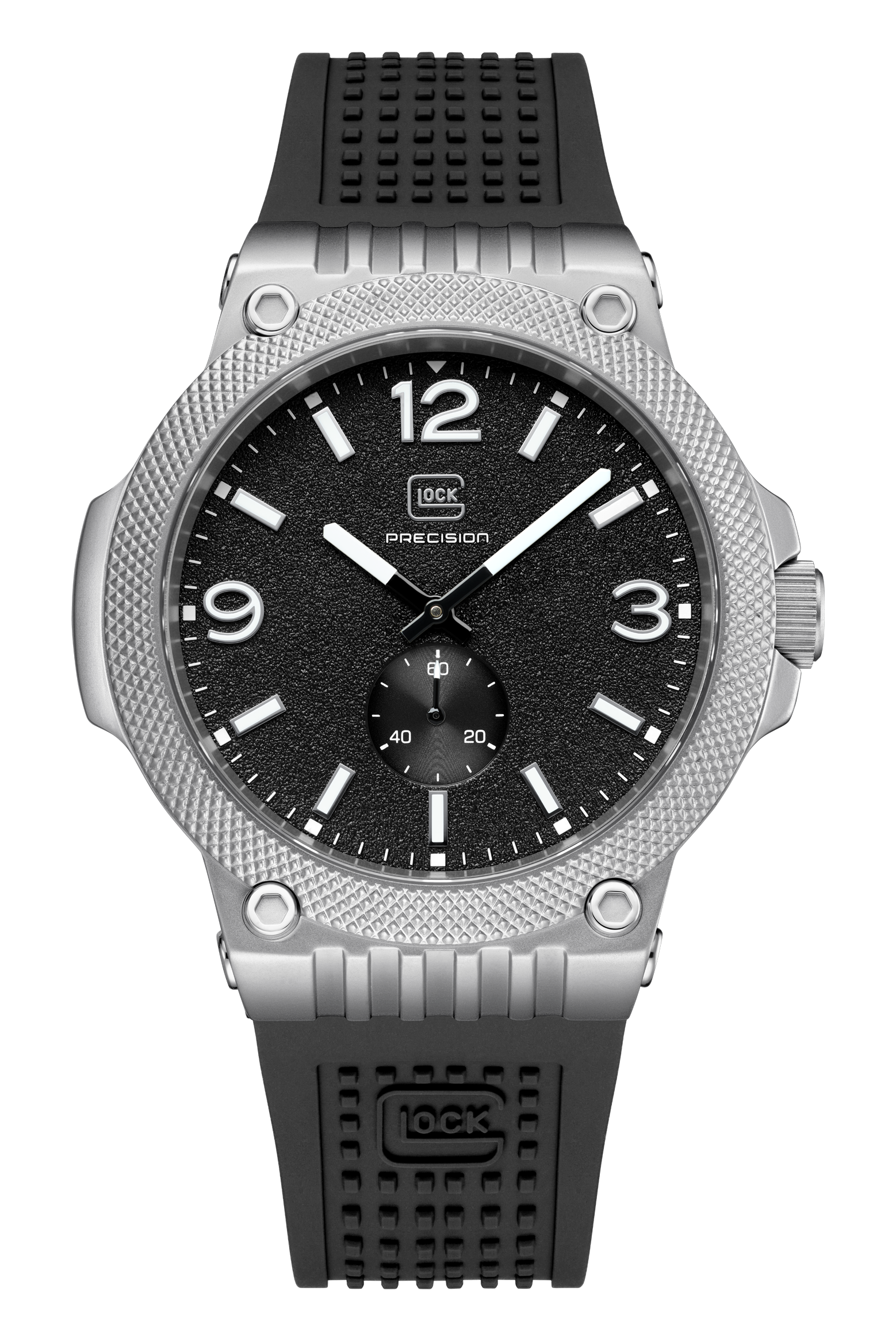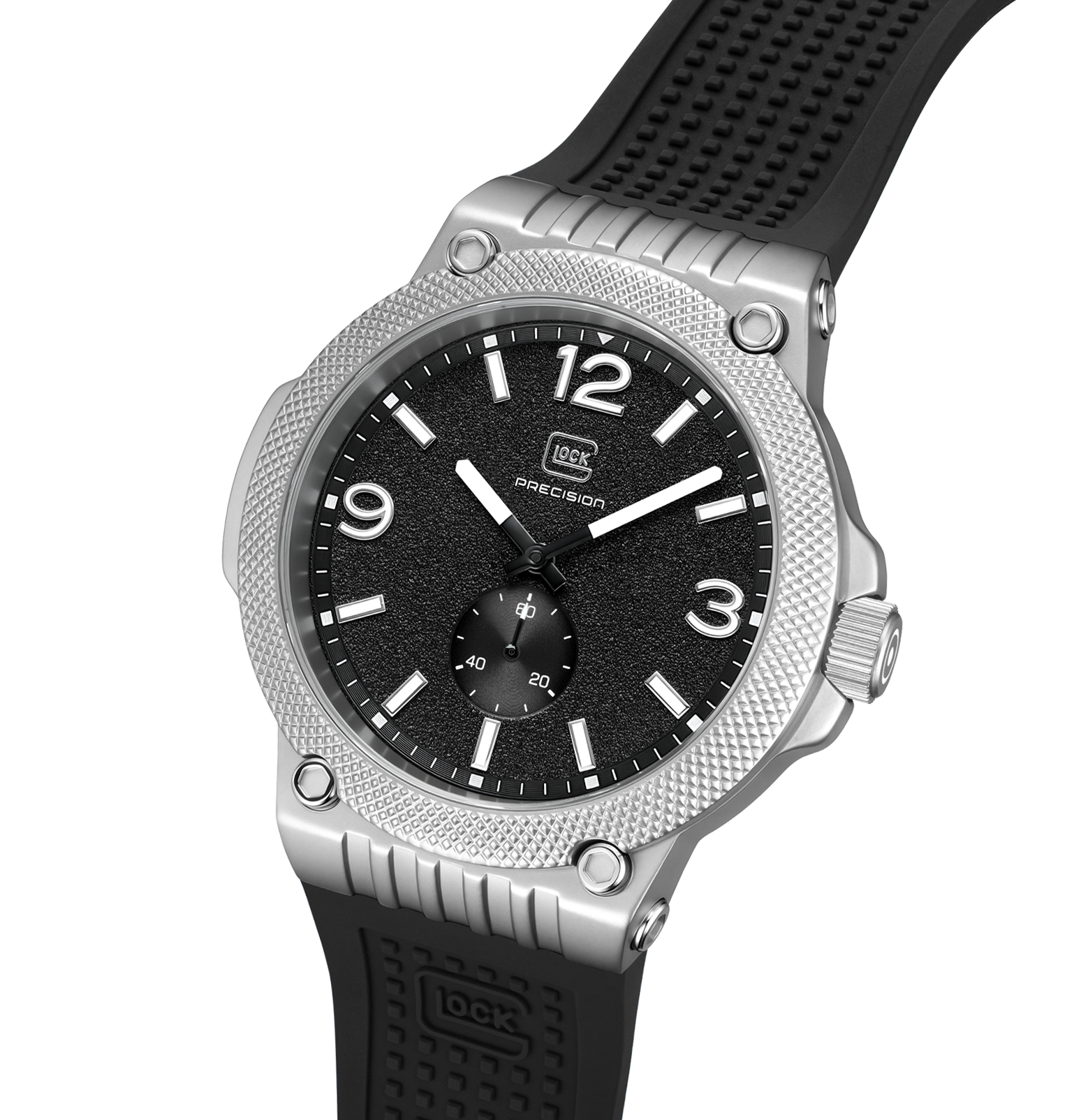 Kraft und Klarheit definieren diesen leistungsstarken Zeitmesser von GLOCK. Das matte Edelstahlgehäuse in Silber wird von einer Lünette mit der ikonischen RTF-Struktur umschlossen – inspiriert vom charakteristischen Griffdesign des GLOCK Originals. Das schwarz strukturierte Zifferblatt ist mit markanten weißen Indizes sowie den Ziffern 12, 3 und 9 versehen, alle mit Swiss Super-LumiNova® für kompromisslose Ablesbarkeit. Ein separates Sekundenzifferblatt bei 6 Uhr sorgt für präzise Zeiterfassung. Das schwarze Silikonarmband mit RTF-Struktur und eingeprägtem GLOCK Logo bietet sicheren Halt und hohen Tragekomfort. Ausgestattet mit kratzfestem Saphirglas und wasserdicht bis 10 ATM ist diese Uhr für jede Mission und jeden Moment bereit.