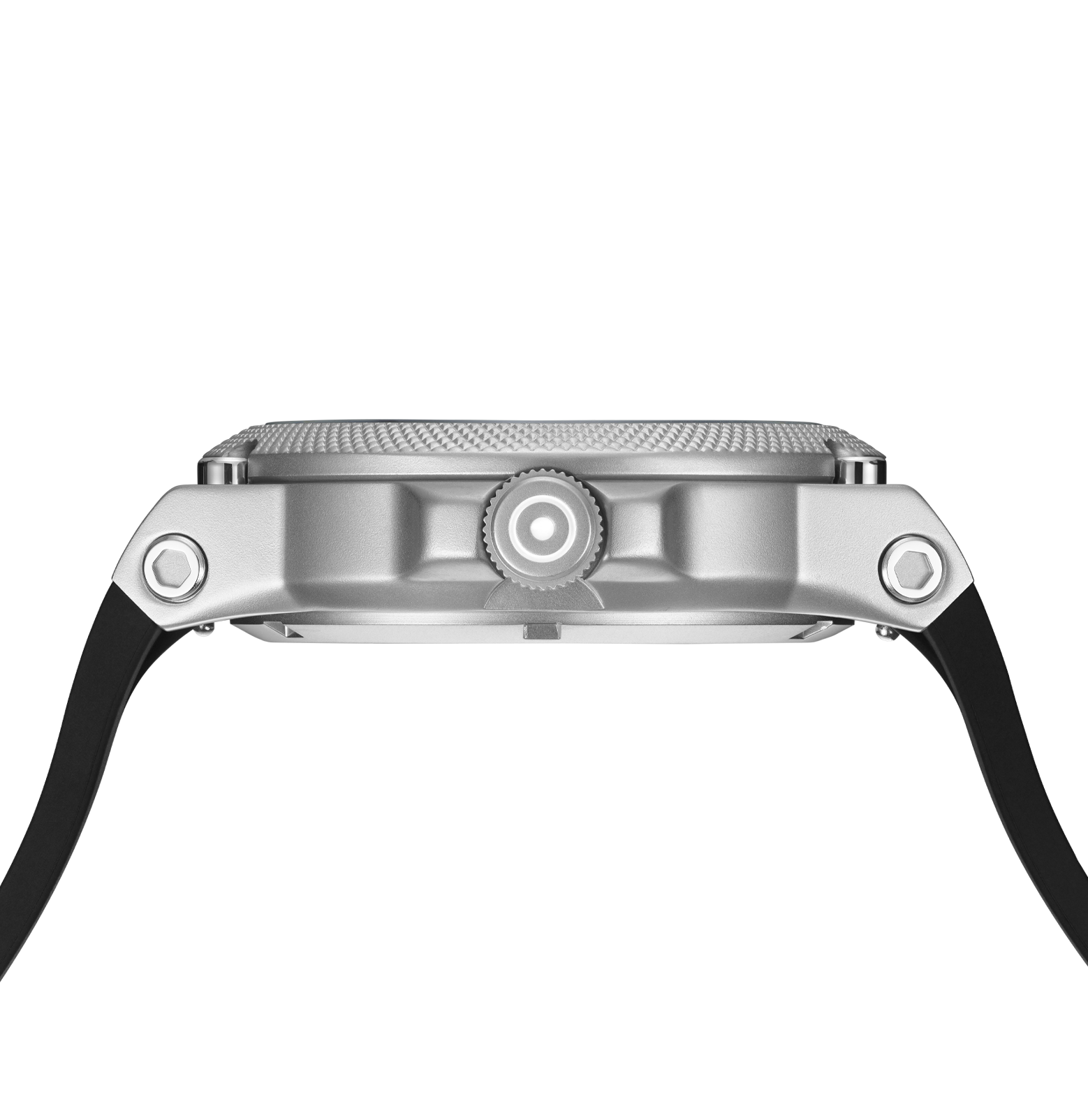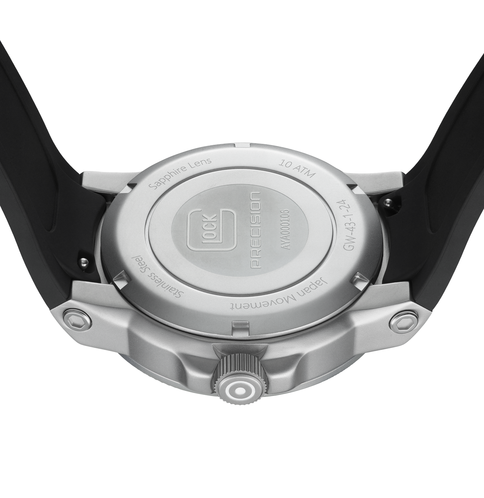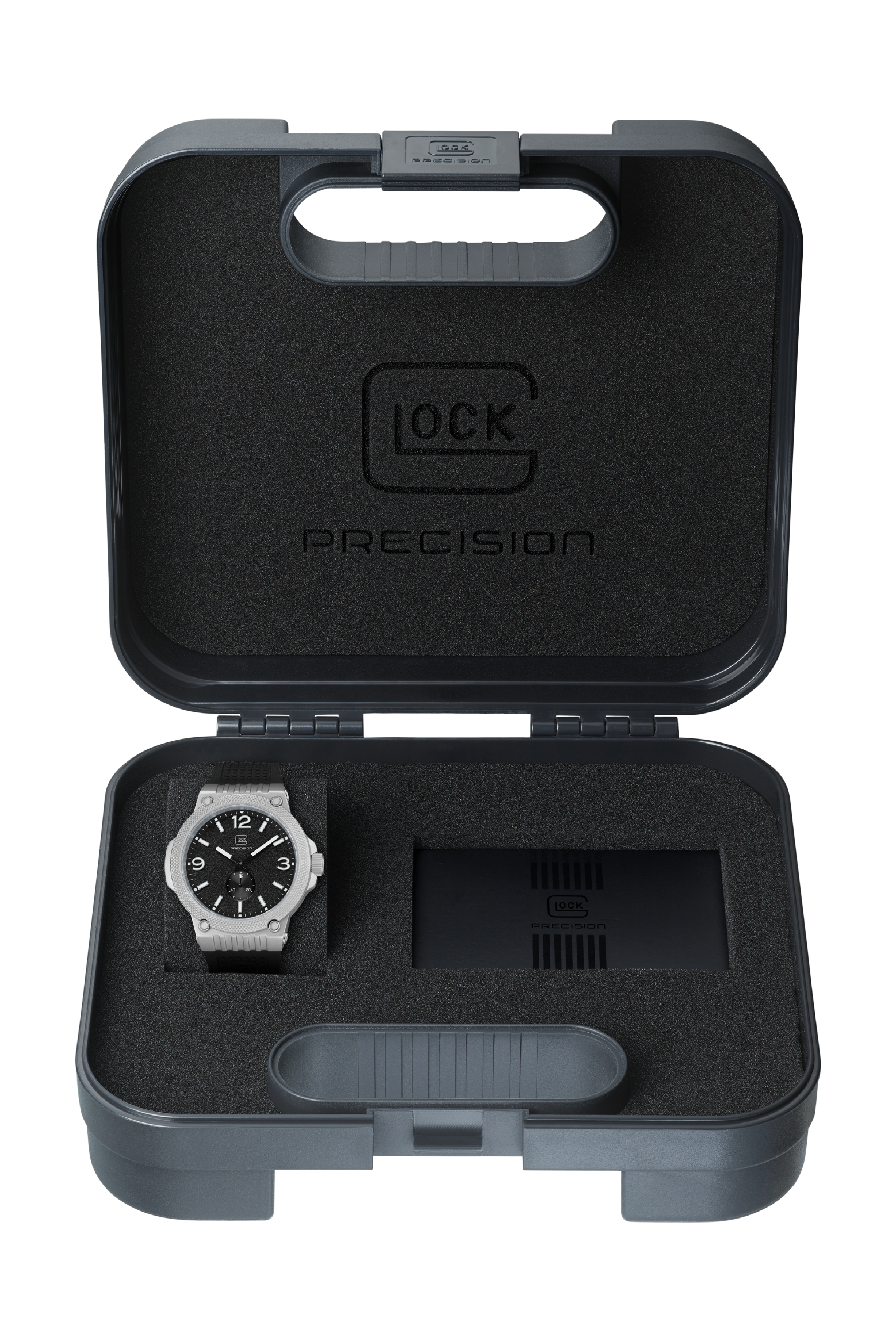 Kraft und Klarheit definieren diesen leistungsstarken Zeitmesser von GLOCK. Das matte Edelstahlgehäuse in Silber wird von einer Lünette mit der ikonischen RTF-Struktur umschlossen – inspiriert vom charakteristischen Griffdesign des GLOCK Originals. Das schwarz strukturierte Zifferblatt ist mit markanten weißen Indizes sowie den Ziffern 12, 3 und 9 versehen, alle mit Swiss Super-LumiNova® für kompromisslose Ablesbarkeit. Ein separates Sekundenzifferblatt bei 6 Uhr sorgt für präzise Zeiterfassung. Das schwarze Silikonarmband mit RTF-Struktur und eingeprägtem GLOCK Logo bietet sicheren Halt und hohen Tragekomfort. Ausgestattet mit kratzfestem Saphirglas und wasserdicht bis 10 ATM ist diese Uhr für jede Mission und jeden Moment bereit.
