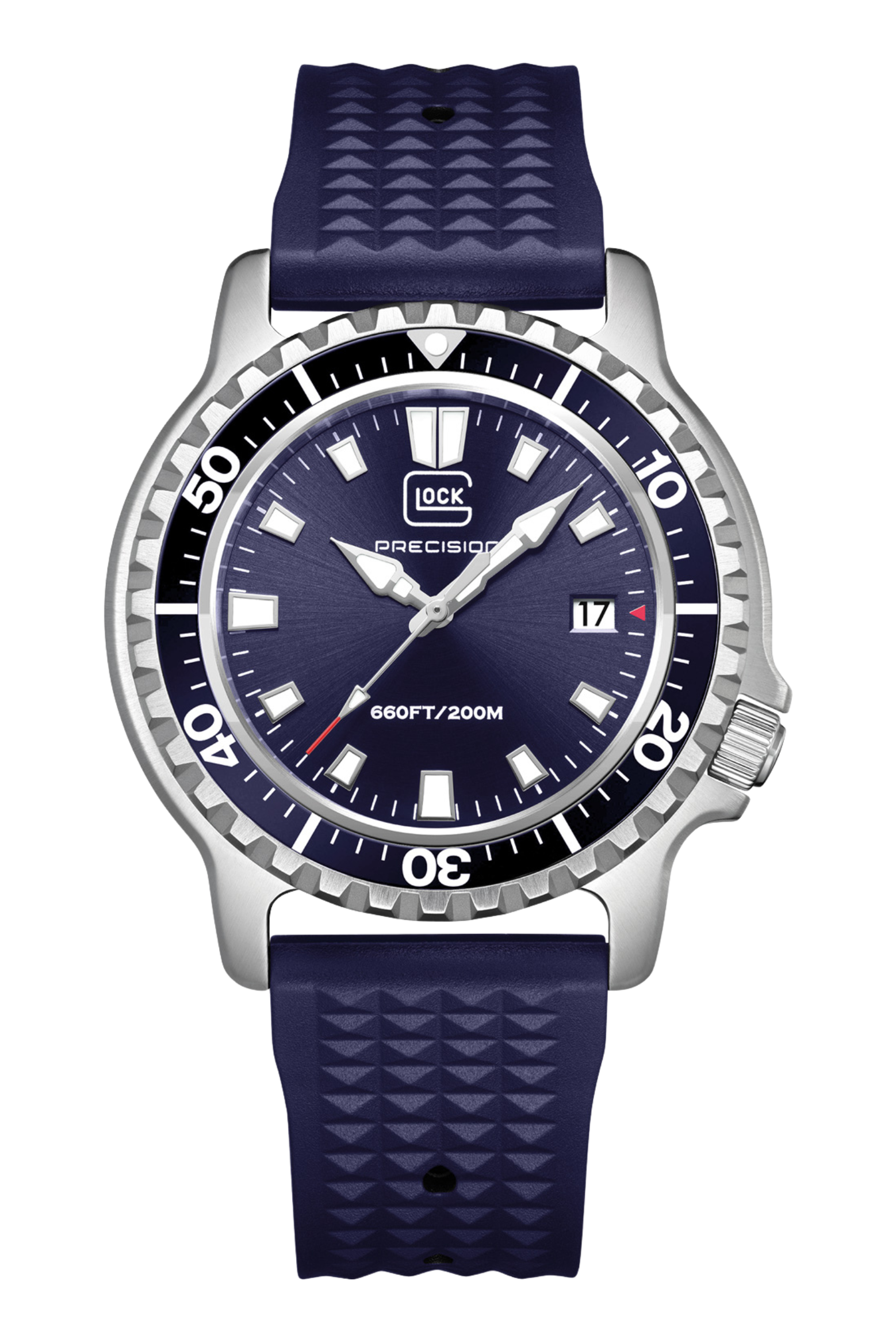 Gefertigt für die Tiefe und gestaltet mit höchster Präzision vereint diese Taucheruhr Leistung und Eleganz. Das silberfarbene Edelstahlgehäuse rahmt ein strahlend blaues Sonnenschliff-Zifferblatt, ergänzt durch einen farblich abgestimmten blauen Lünettenring, der den maritimen Charakter der Uhr unterstreicht. Zeiger und Indizes mit Swiss Super-LumiNova® gewährleisten optimale Ablesbarkeit selbst in den dunkelsten Gewässern. Das blaue Silikonarmband bietet Langlebigkeit und Tragekomfort und verbindet sportliche Dynamik mit stilvoller Eleganz. Mit einer Wasserdichtigkeit von 20 ATM ist diese Uhr für Entdecker gemacht – ein Sinnbild für Zuverlässigkeit, Präzision und die beständige Handwerkskunst des GLOCK Designs.
